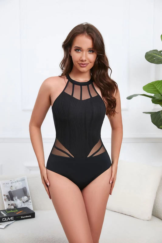Black One Piece Mesh Halter Top Swimsuit